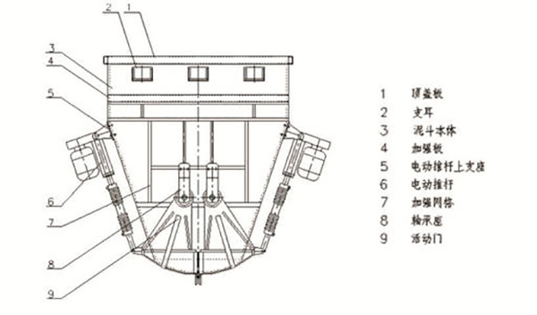 气(电)动污泥斗(又称自动储泥斗)底部有两个扇门,由门的开合控制腔体污泥排泄,每个扇形门由一个气缸(电动推杆)控制开关。